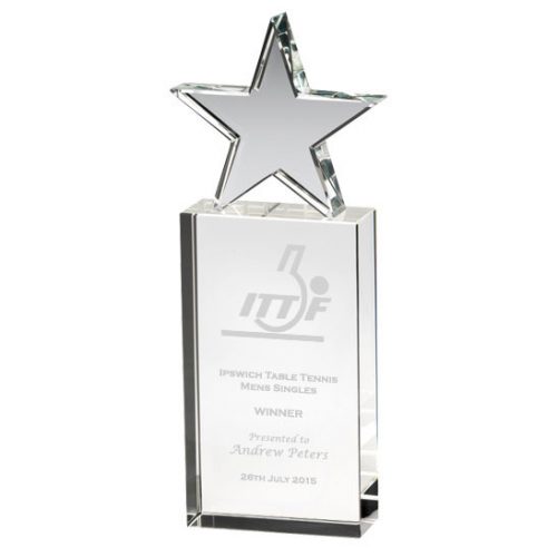 Check out our great range of Table Tennis Glass trophies and awards. Our Table Tennis glass trophies and awards are available in a wide range of styles, shapes and sizes. So they are Suitable for any Table Tennis event and competition. Personalise your selection with engraving text and/or a logo.