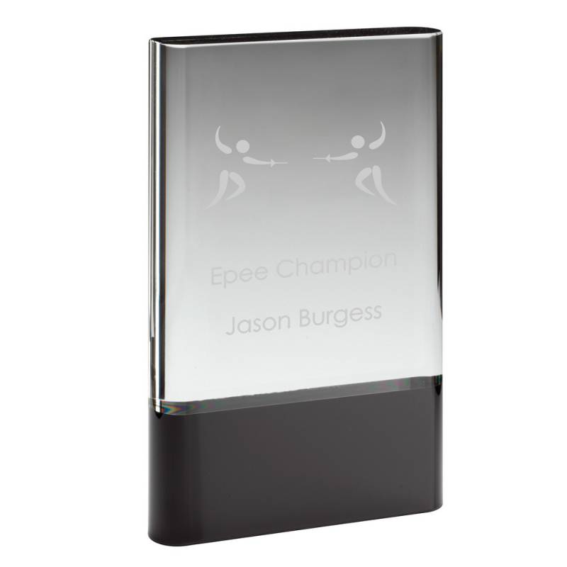 Clear and black glass Fencing trophy approximately 30mm thick available in 3 Sizes.