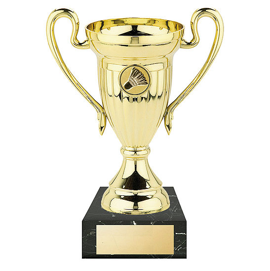 Gold plastic cup mounted on a solid black marble base, available in 5 sizes.