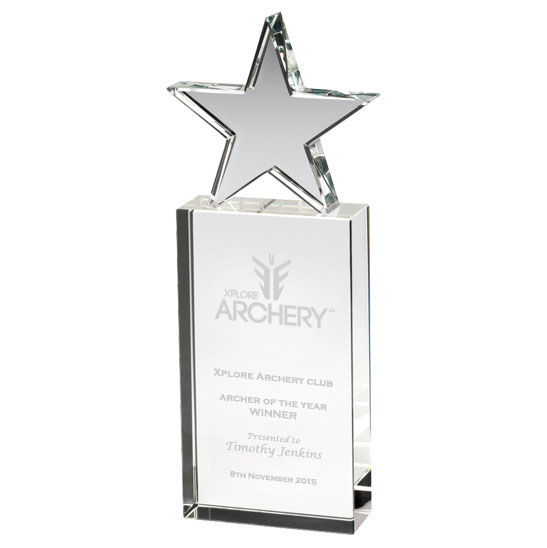 The JB1800 Archery Glass Star Trophy is available in three sizes. This clear glass column with star award is 30mm thick. It is from the premier glass award range and so comes with a presentation box as standard. The different sizes available make this award suitable for varying budgets.